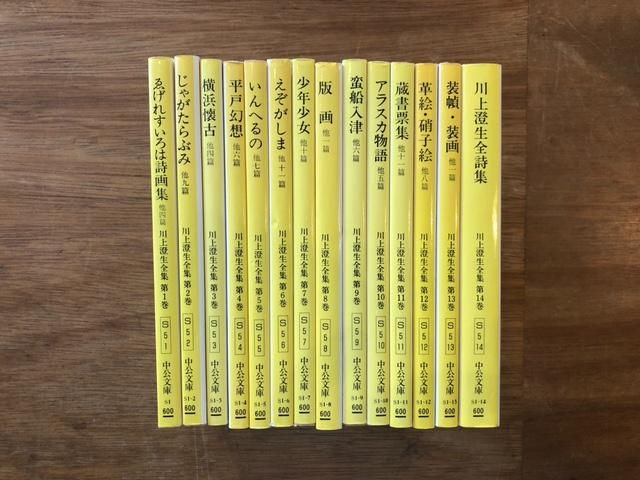 ホーム / アート・デザイン / 日本のアート・美術 川上澄生全集 文庫版 全14巻揃 前のページに戻る 日本を代表する版画家川上澄生の全集です。 中公文庫版。 版画、詩集、詩画集、蔵書票本、ガラス絵、装幀、その全て。 作品はもちろんフルカラー。 第1巻 ゑげれいすいろは詩画集 他四篇 第2巻 じゃがたらぶみ 他九篇 第3巻 横浜懐古 他四篇 第4巻 平戸幻想 他六篇 第5巻 いんへるの 他七篇 第6巻 えぞがしま 他十一篇 第7巻 少年少女 他十篇 第8巻 版画 他一篇 第9巻 蛮船入津 他六篇 第10巻 アラスカ物語 他五篇 第11巻 蔵書票集 他十一篇 第12巻 革絵・硝子絵 第13巻 装幀・装画 他1篇 第14篇 川上澄生全詩集 著者:川上澄生 出版社:中央公論社 1982-1983 文庫 C(セット用外箱欠/全て経年並/目立った汚れはありません) 状態 状態について A : 新品同様 B : 汚れや痛みなどが少なく、古書としてきれいな状態 C : 古書として標準的な状態 D : 汚れ、傷みあり ※当店では商品への値段の書き込み、ラベル貼りは行っておりません。 販売価格 4,400円(税込) sold out 最近チェックした書籍 一握の砂 1,320円(税込)